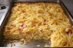 Punem pastele la fiert in apa cu sare,apoi le clatim cu apa rece si le punem intr-o tava unsa cu unt. Taiem cubulete mici salam sau bacon, adaugam pe deasupra pastelor,frisca lichida,si un sfert din branza rasa,sare si amestecam pastele. Pe deasupra pastelor adaugam toata branza rasa in asa...